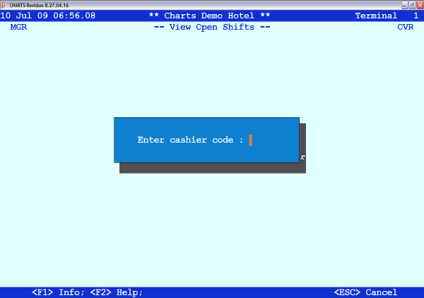At this point, if a particular cashier shift requires attention, and that cashier code is known, enter the code into the prompt. Alternatively, press F1 to display a list of open cashier codes.